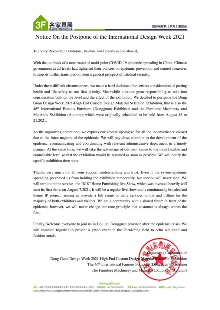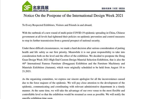 Originally scheduled for August 18-21, 3F fair, one of China’s largest furniture fair for the domestic market has been postponed due to the volatile COVID-19 development across China. No new dates have yet been set.