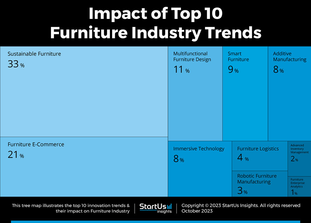 Based on the Furniture Industry Innovation Map, the Tree Map below illustrates the impact of the Top 10 Furniture Industry Trends in 2024. With the increasing emphasis on environmental protection, furniture makers are adopting recyclable materials to embrace sustainable production processes. Further, multifunctional and modular furniture designs are trending for space-saving. Startups employ IoT technologies to produce furniture that allows users to control features using smart devices or voice commands.