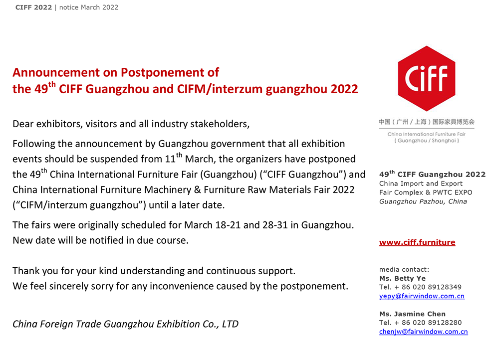 Following the announcement by the Guangzhou government that all exhibition events should be suspended from 11th March, the organisers have postponed the 49th China International Furniture Fair (Guangzhou) (“CIFF Guangzhou”) and China International Furniture Machinery & Furniture Raw Materials Fair 2022 (“CIFM/interzum guangzhou”) until a later date.