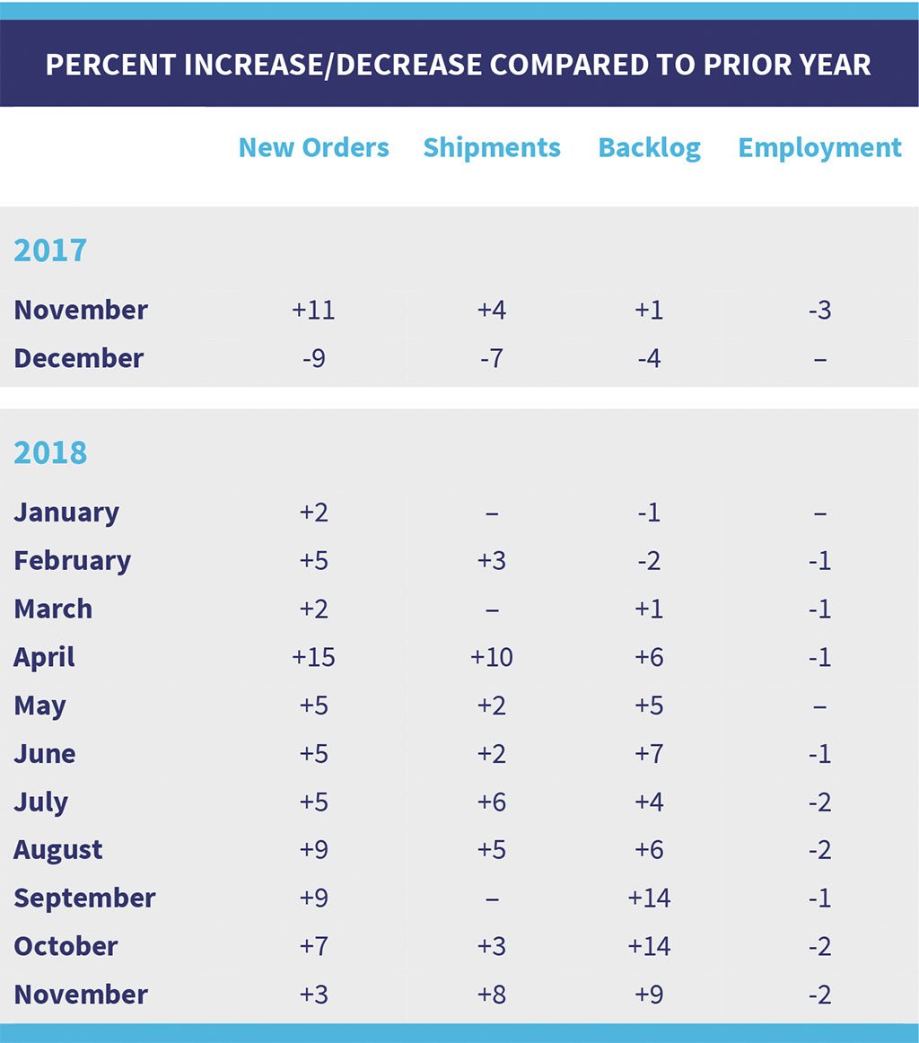 Shipments were 8% higher than November 2017 compared to a 4% increase reported in the November 2017 comparison to November 2016. We had noted that we expected shipments to start catching up some since backlog seemed to be high. Some 62% of the participants reported increased shipments for the month compared to the previous year. Year to date, shipments remained 3% ahead of last year with 68% reporting increases. Last year, year to date shipments through November were up 5%. Backlogs increased 1% in November as the dollar value of orders was higher than the dollar value of shipments. Backlogs were 9% higher than last year compared to doubledigit increases reported the last couple of months.